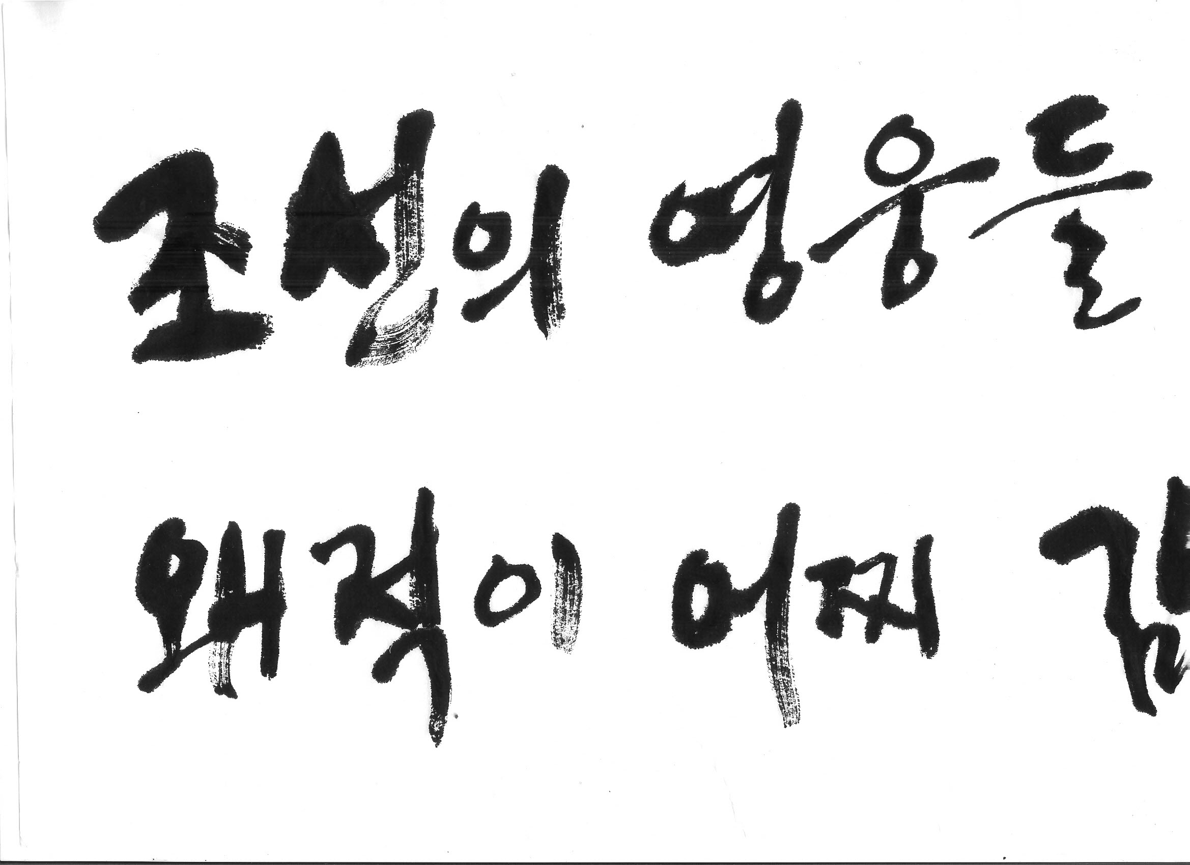 힘찬 캘리 부탁합니다. 김철호 일반 0 13361 2008.09.22 00:49 > > 조선의 영웅들, 천하에 당할 자 없으니 > > > 왜적이 어찌 감히 조선을 넘보리오 > > > > 이렇게 두 문장입니다. > 임진왜란을 주제로 한 캘리인데요. 염치없지만 부탁드려 볼꼐요. >